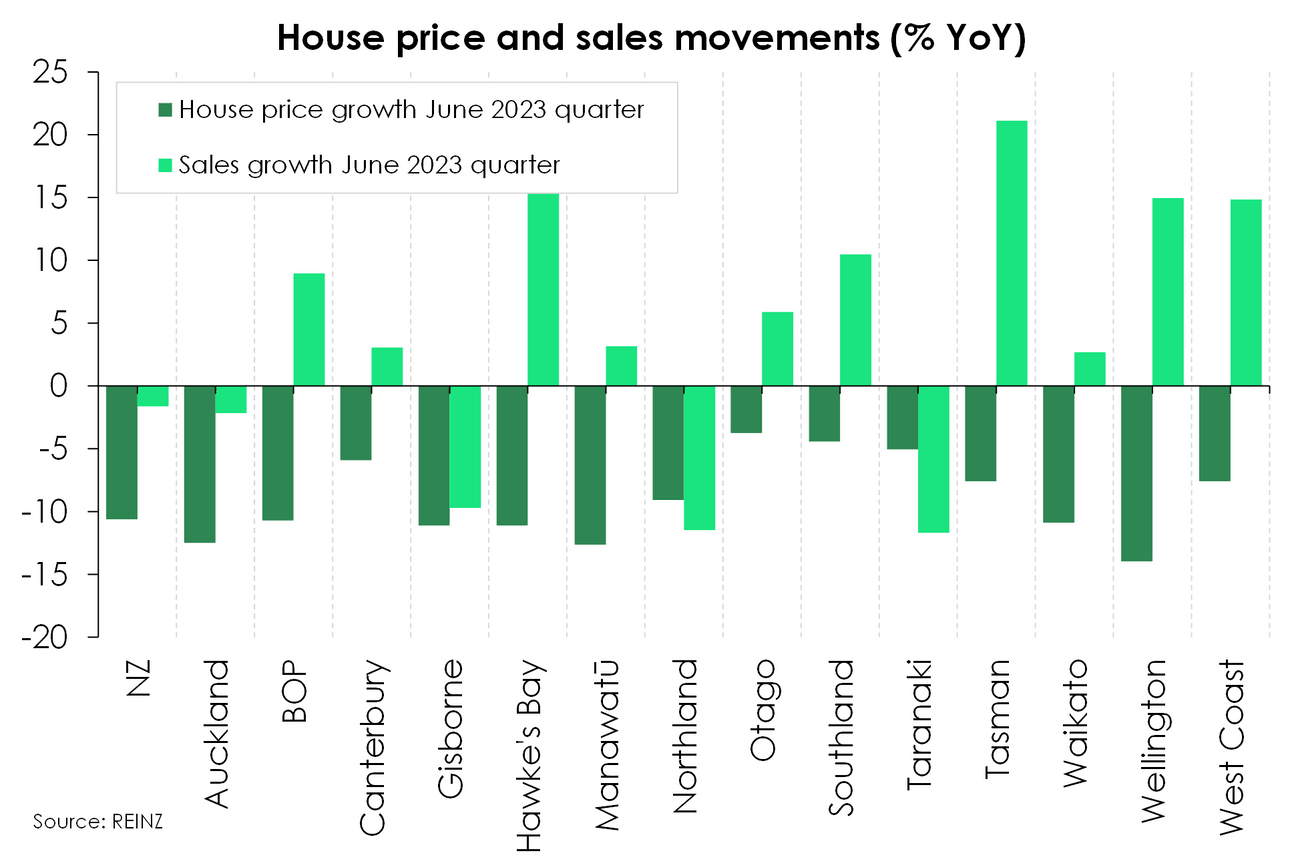 There are mixed gains and losses across the regions, but green shoots are emerging. For much of the past two years the housing market has fallen under the pressure of tightening credit conditions, rapidly rising mortgage rates, investor tax policy changes, and stretched affordability. But it seems that a recovery is afoot. Since their peak in November 2021, house prices had fallen a cumulative 17.7% – bottoming out in May. Since then, house prices have risen 2.8% with further signs of strength to come.