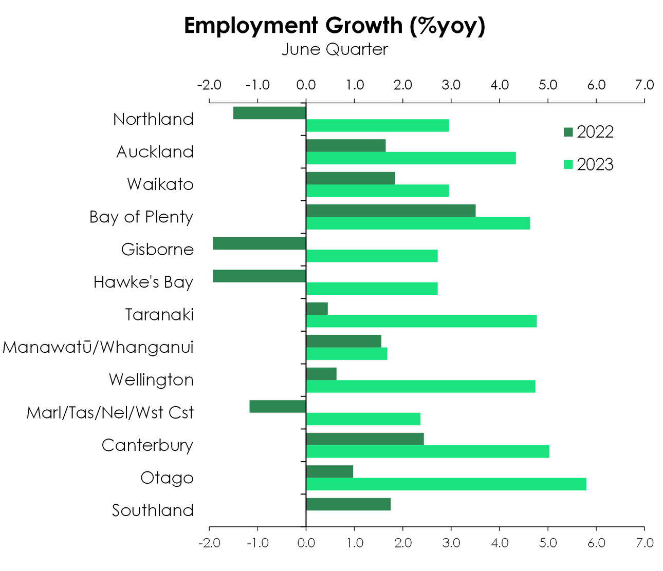 Nationally, employment has expanded a whopping 4% over the year, with tourism the main beneficiary. Tourism-related employment has now returned to pre-Covid levels with the top 10 occupations of those coming to our shores concentrated in the services sector, specifically hospitality. As such, Otago – boosted by Queenstown – recorded the strongest employment growth (5.8%). For the same reasons, the Bay of Plenty recorded a solid 4.6% lift in employment.