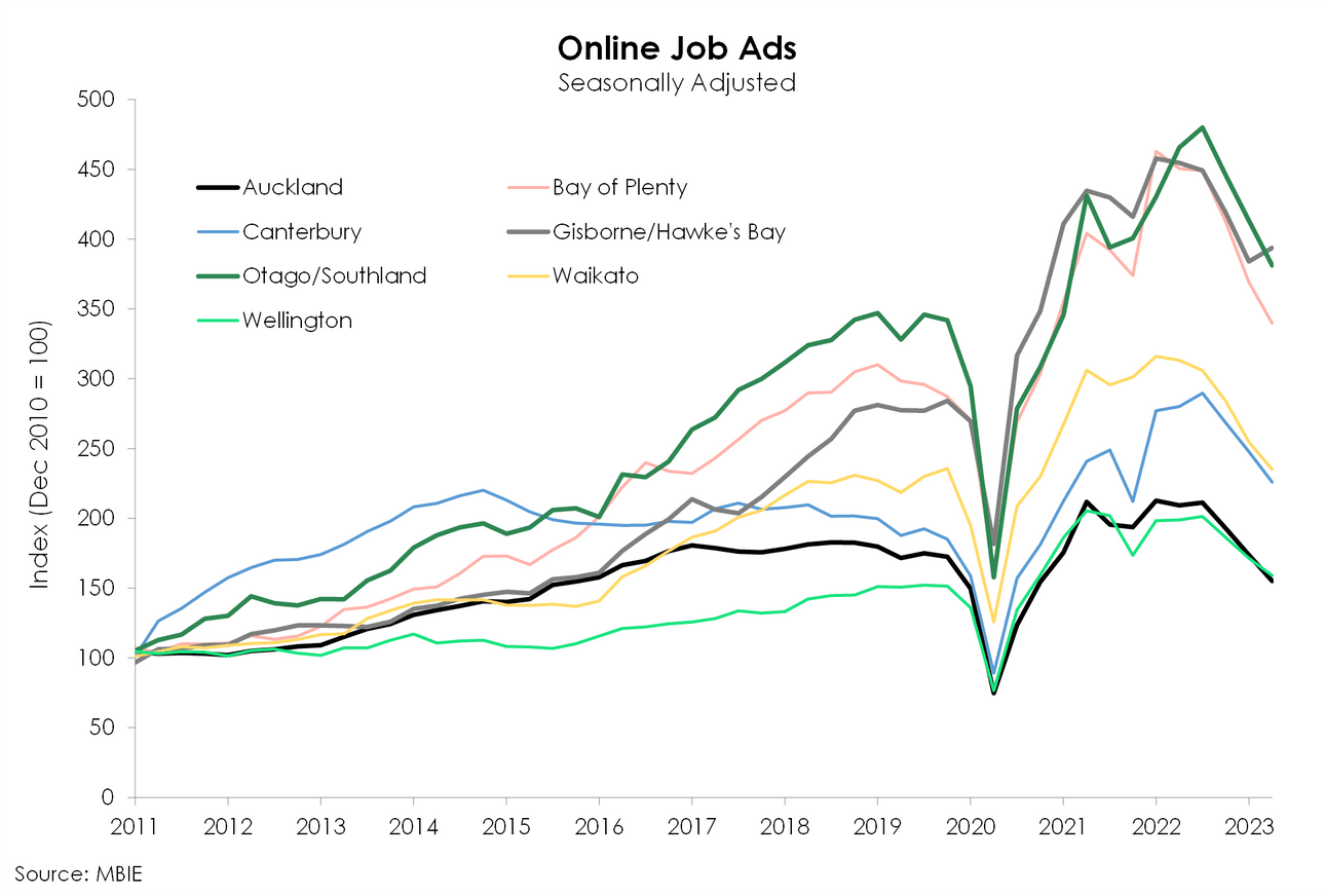 But beyond the big cities the regions are playing catch up. House prices in Northland only hit a peak in January last year and remain in a downtrend. Meanwhile down south, Canterbury’s housing market has experienced a softer landing compared to the sharp fall in other markets. House prices in the Garden City have fallen just 8.5% from the peak.