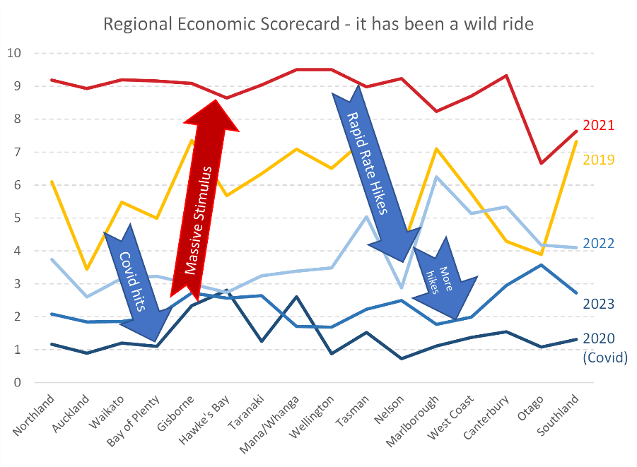 Otago gets our trophy for best economic performance with a lonely high score of 3.6. But before the scarfies celebrate, we should point out that Otago’s win was largely thanks to Queenstown – our tourist mecca.