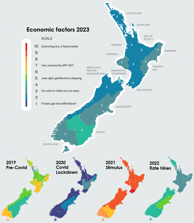 Outside Otago, the South Island fared better than most of the North Island. However, the southern regions experienced the most drastic slowdown compared with last year. On average, activity in the south went from ‘Just right’ (5) in 2022 to “chilly” (2) today.