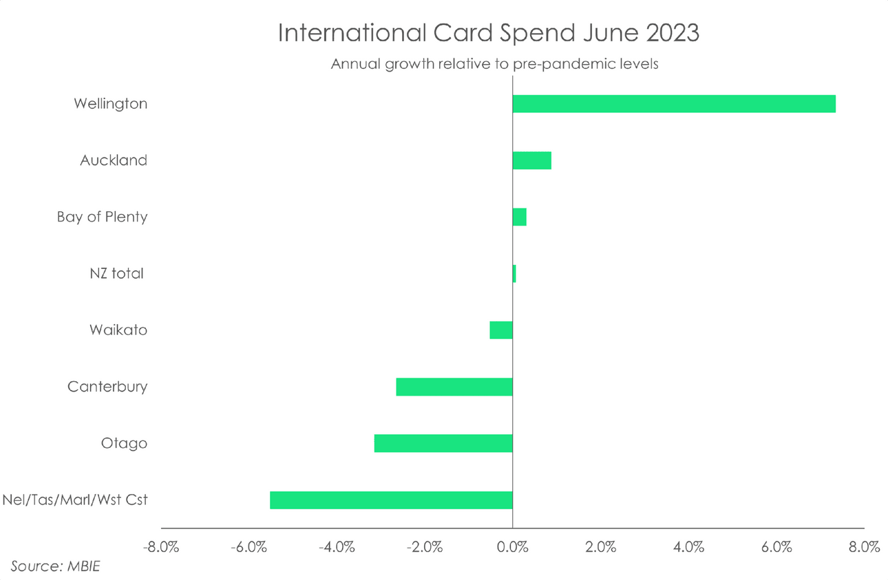 After just a year from re-opening the borders, tourism has bounced back strongly, but is still soggy. In the year to June 2023, total international card spend grew just 0.1%, relative to pre-Covid levels.