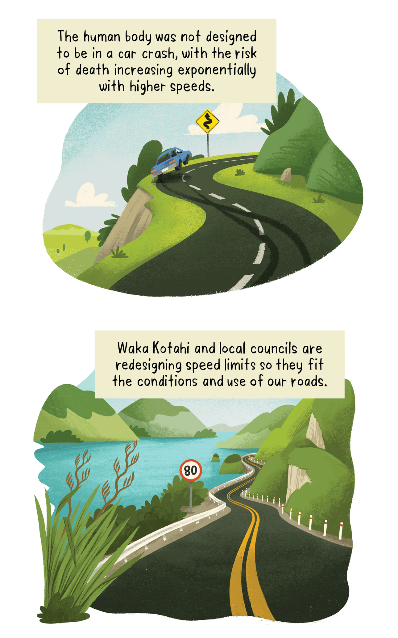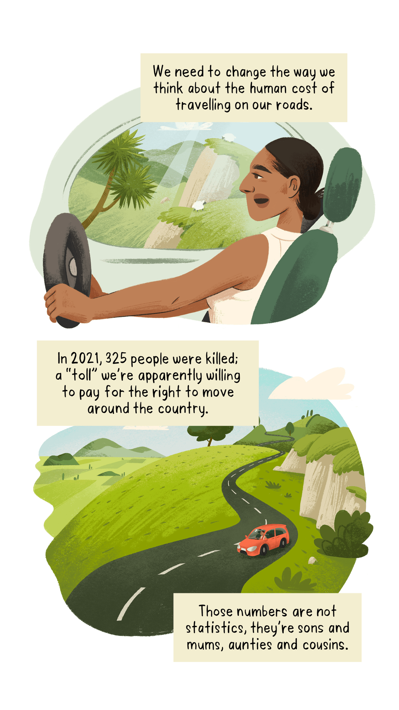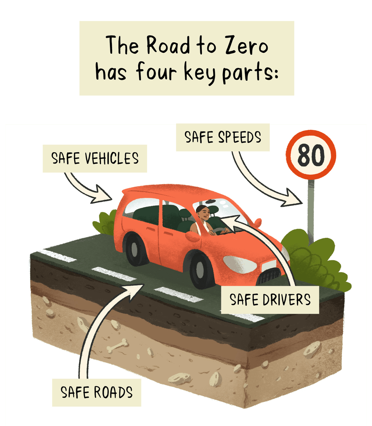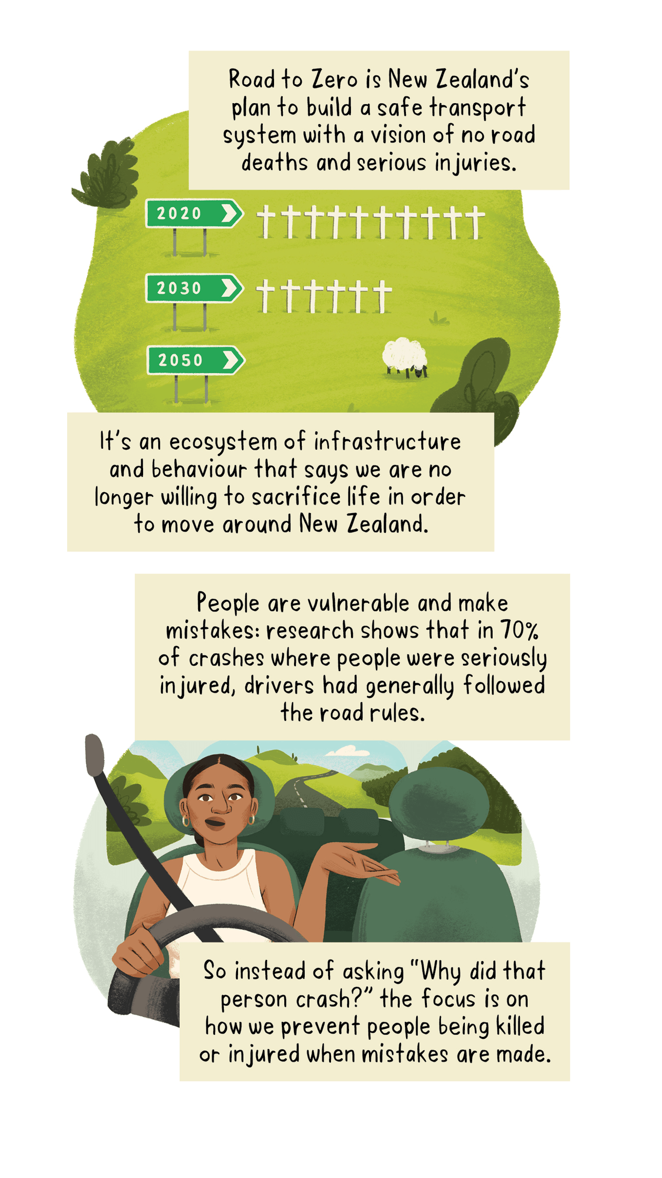 Road to Zero is Aotearoa’s plan to create a safe transport system with a vision of no road deaths and serious injuries. Illustrations by Hope McConnell.
