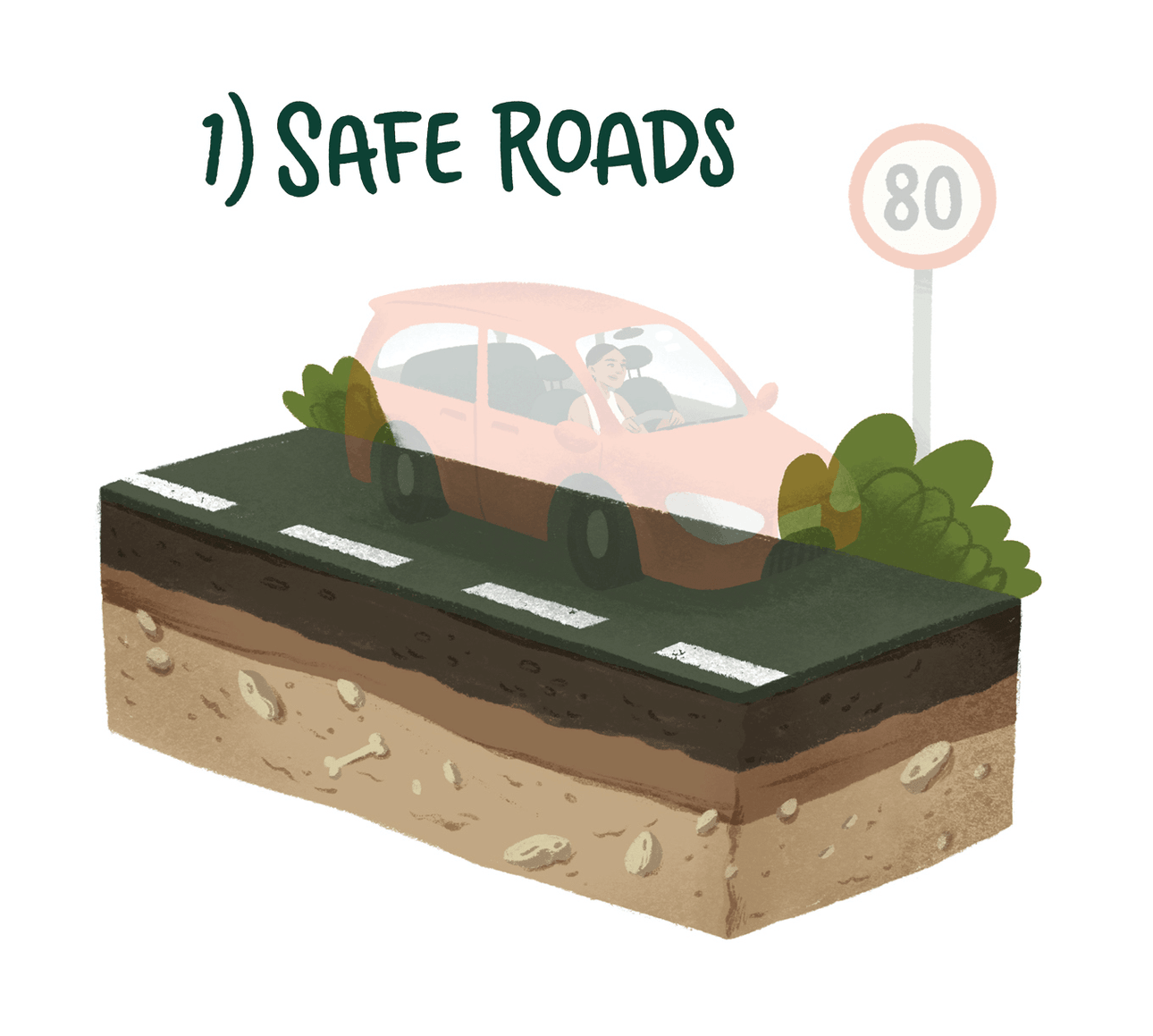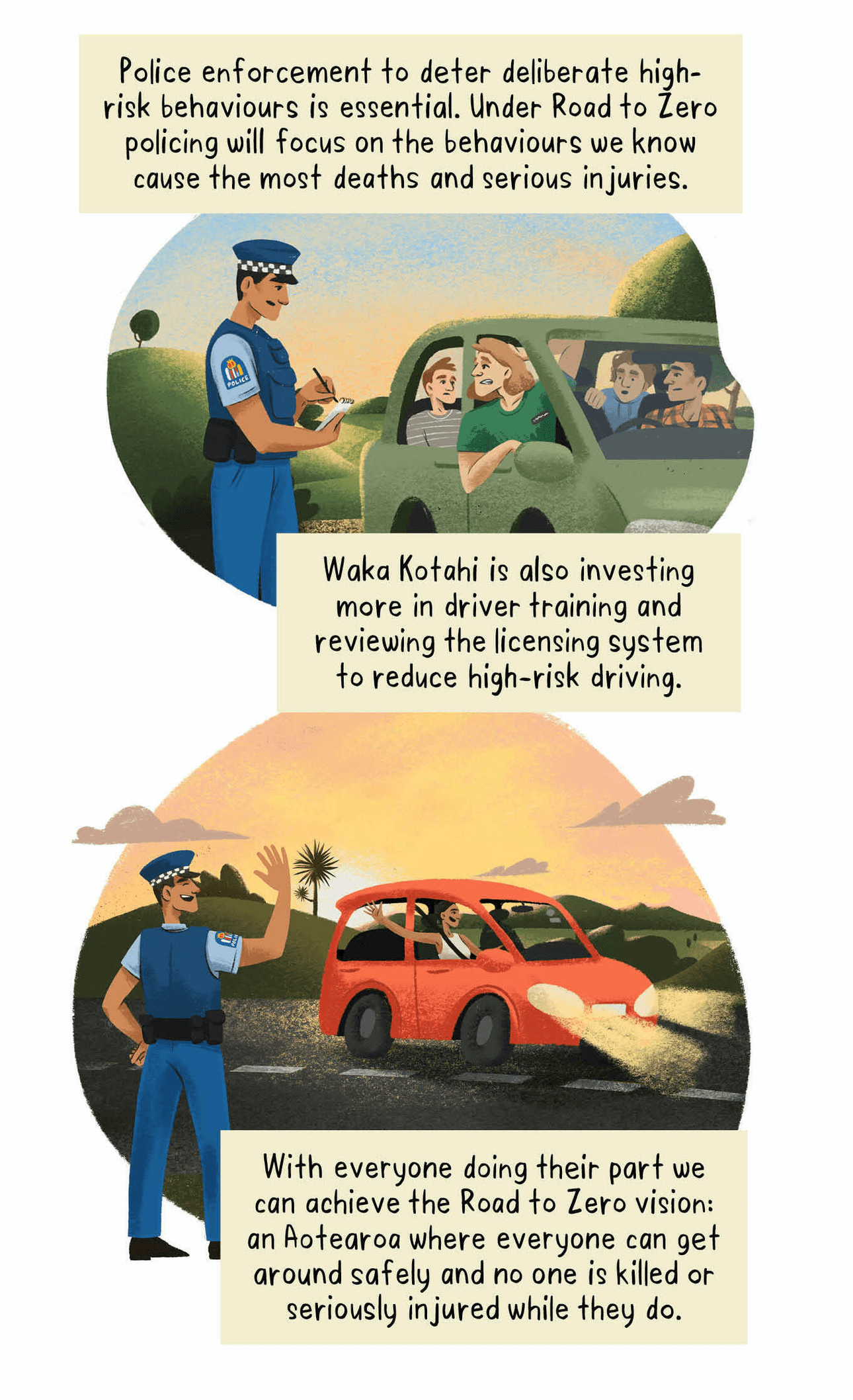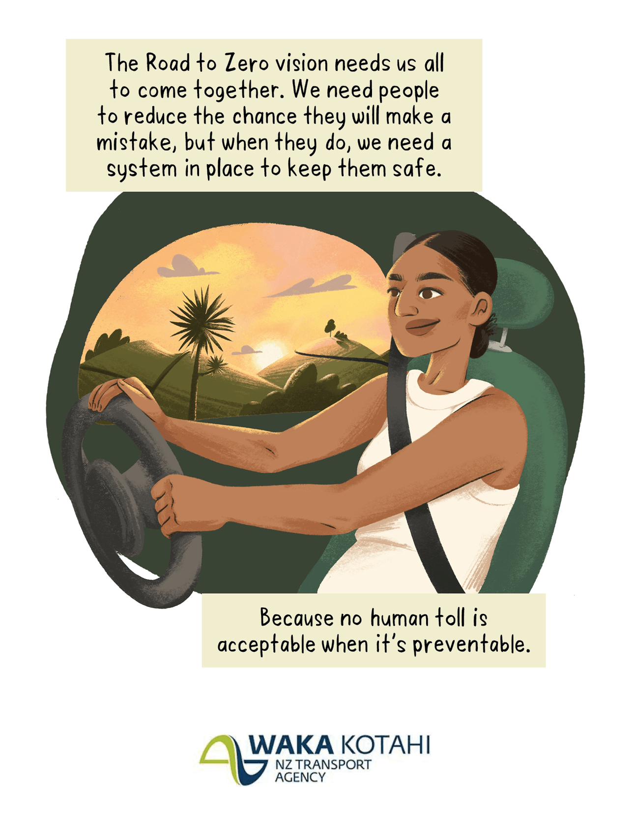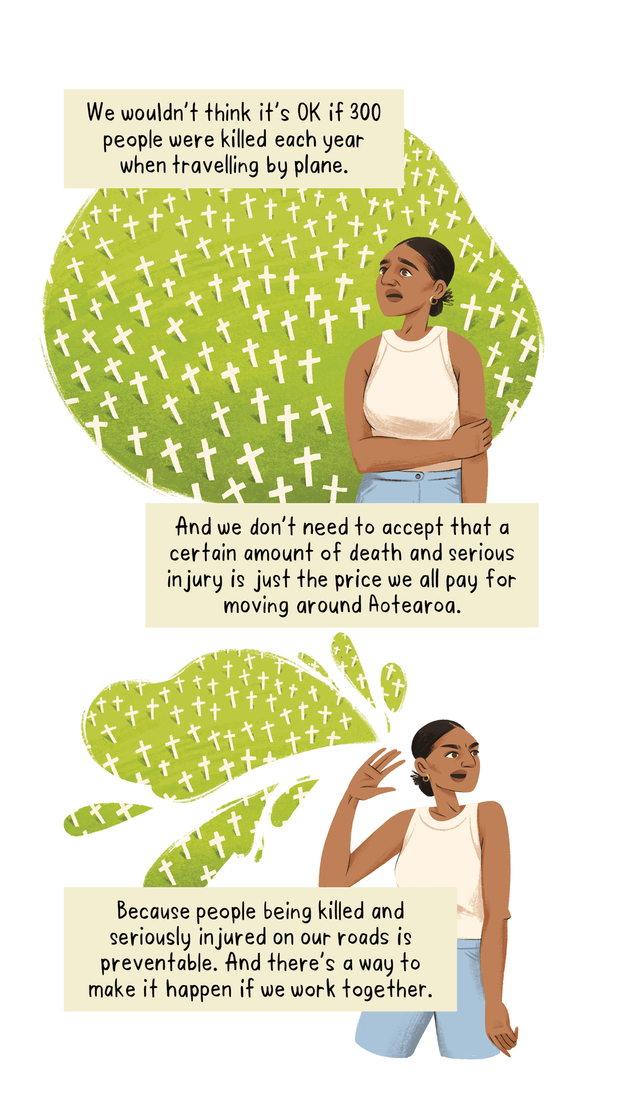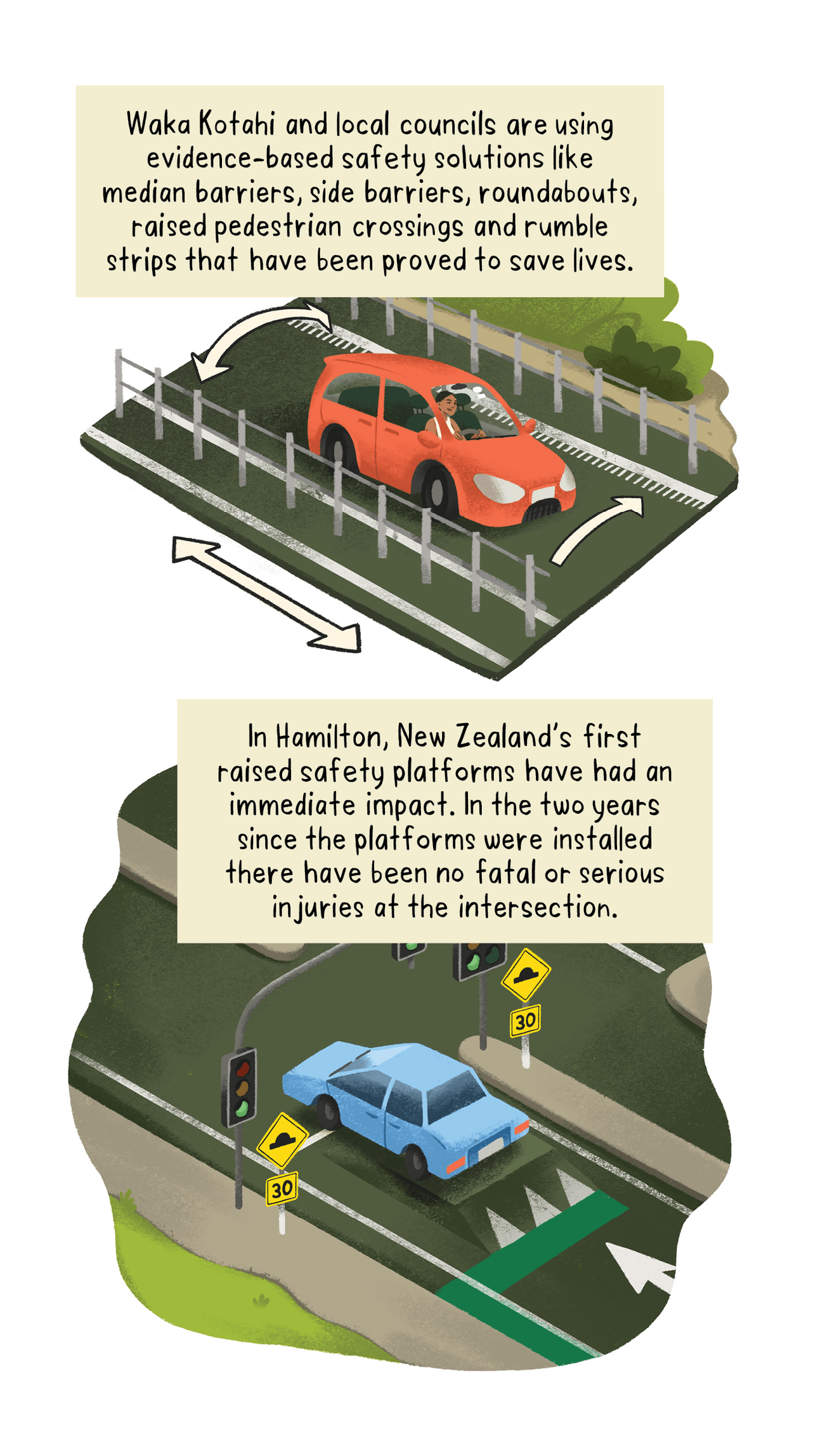 Road to Zero is Aotearoa’s plan to create a safe transport system with a vision of no road deaths and serious injuries. Illustrations by Hope McConnell.