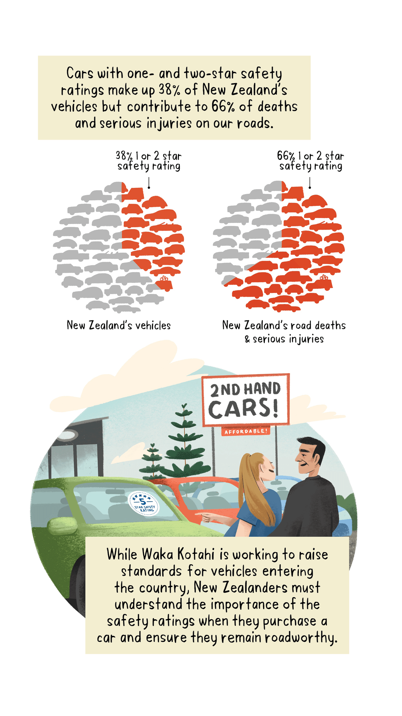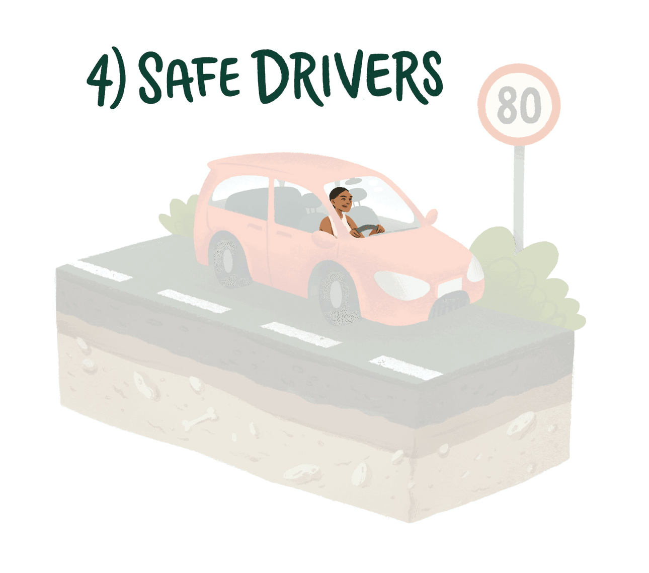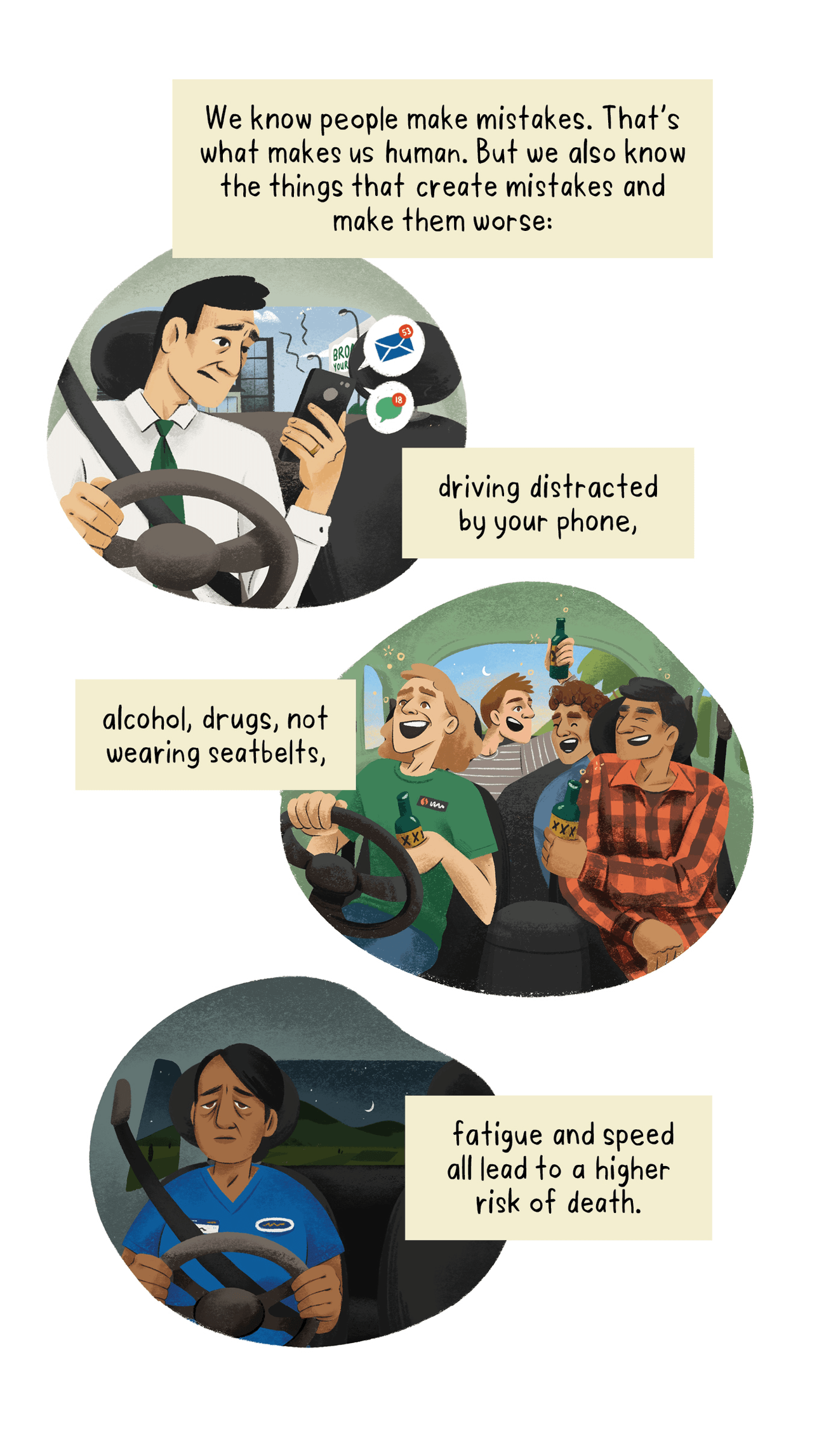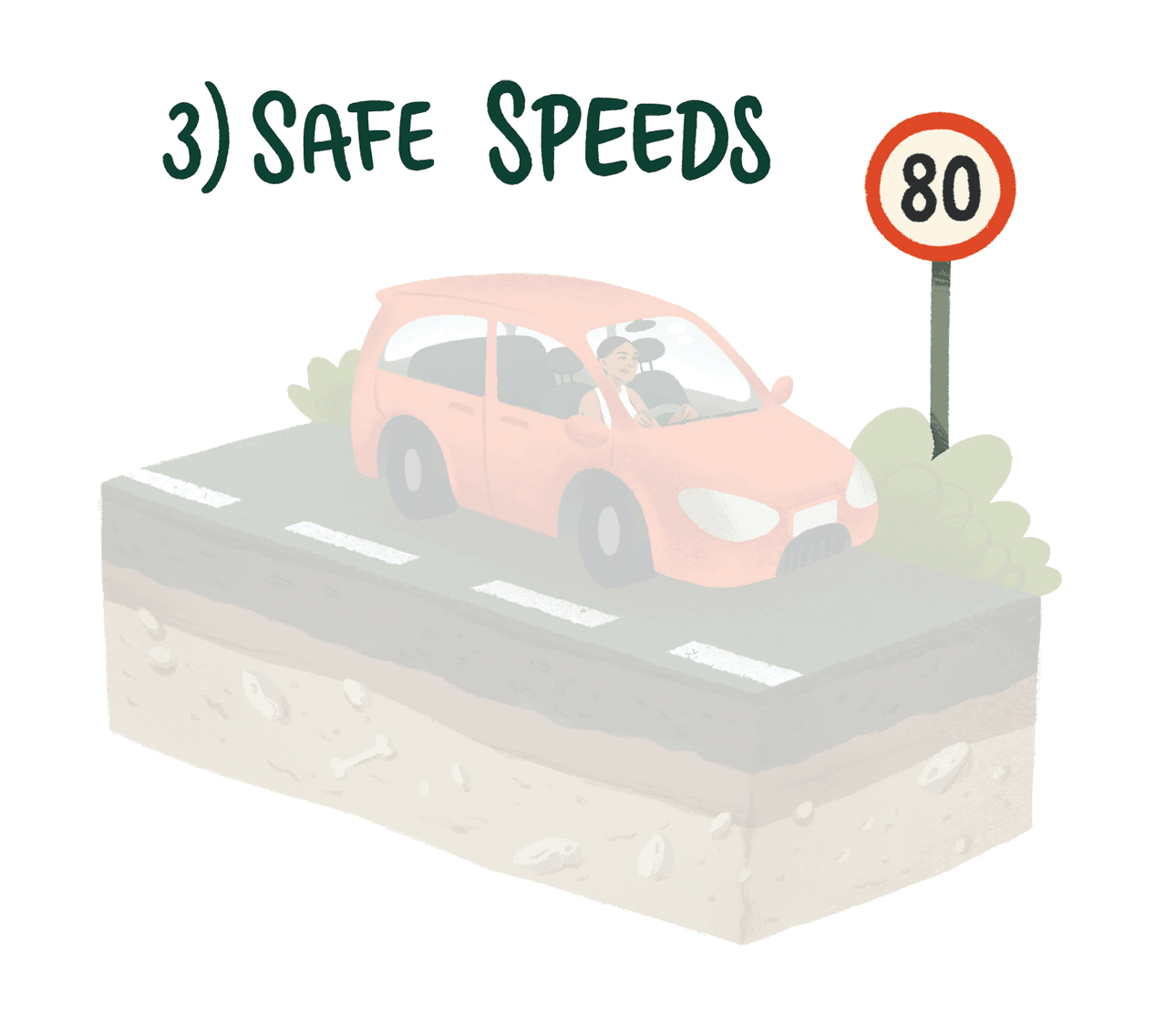 Road to Zero is Aotearoa’s plan to create a safe transport system with a vision of no road deaths and serious injuries. Illustrations by Hope McConnell.