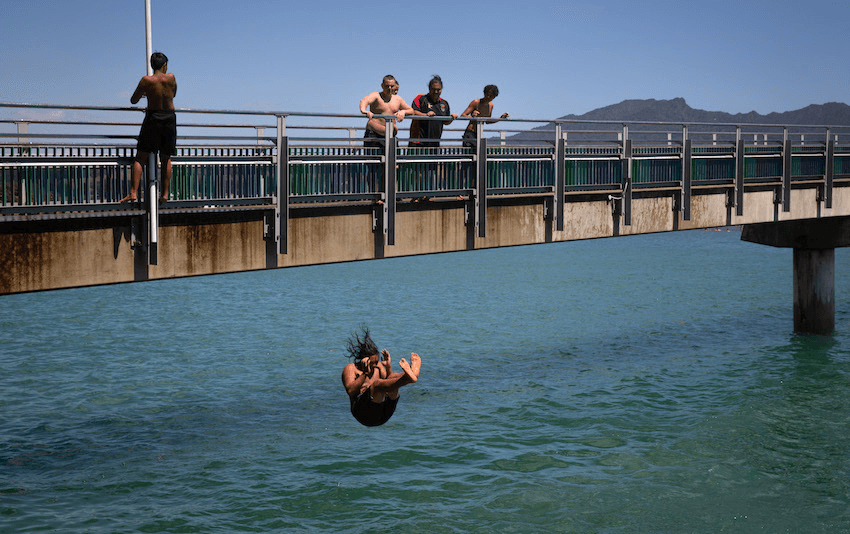 No one can say for sure when the manu – or its variations – came into existence, let alone when they became a staple of New Zealand movement. Watch any YouTube clip with the words “manu” and “bomb” in the title and it’ll be accompanied by a heated debate in the comments over which town ‘invented’ the manu. Auckland bombers say it began in the early 1990s, with bomb competitions regularly held at the outdoor Moana-Nui-a-Kiwa pools in Māngere, while Raglan locals claim they’ve been popping manus since the old Te Kopua Bridge was built in 1963. Even the name has been brought into the dispute. Many call the act of entering the water bum first a manu, though some say ‘manu’ is merely an abbreviation of Māngere, its real name. Even then, Māngere could either be in reference to the pools or to the English translation of māngere being lazy, as in a lazy bomb. Tauranga locals call it a V-bomb, for obvious reasons.
