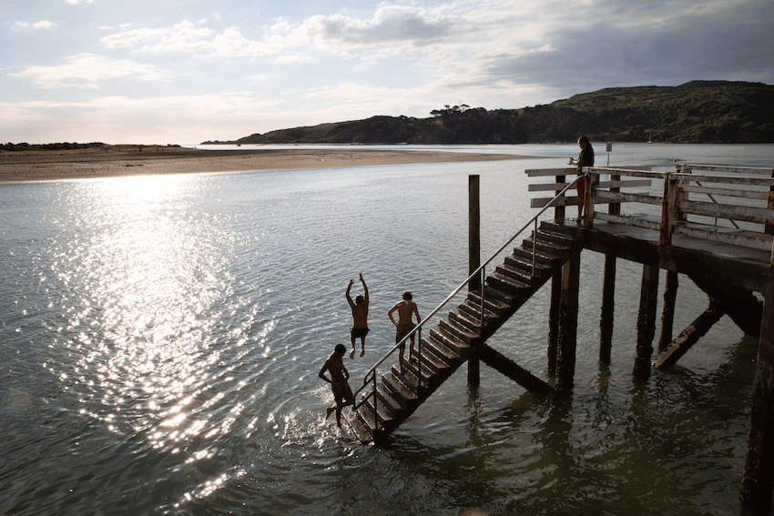 Children bomb off a bridge in Raglan (Photo: Sylvie Whinray).