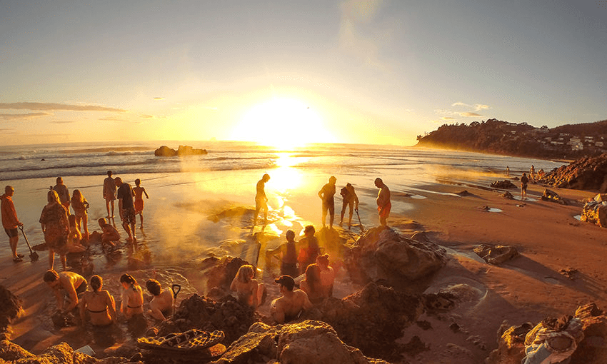 Hot Water Beach is on every Coromandel to-do list, with good reason. There’s something profoundly satisfying about what it entails, utilising the heat provided by an underground thermal river to dig up a natural spa you made yourself. The process begins with a spade – bring your own, or rent one from the nearby shops for $5 (surely the best business model in the region). Then, head to the surprisingly narrow spot around the middle of the beach as the tide heads out. Next, dig like crazy.