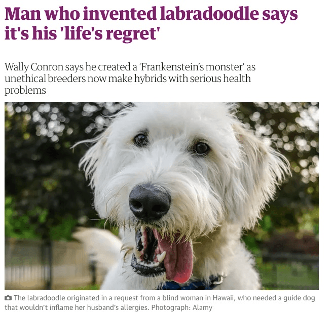 Labradoodle creator Wally Conron became so concerned by the rise in haphazard breeders and the health problems they can unleash that he called the labradoodle “his life’s regret”. “I opened a Pandora box and released a Frankenstein monster,” he told the ABC. Lomas is similarly worried about backyard breeders, and says the lack of breeding regulation has created a “scary situation” for consumers and animals alike. “It concerns me that there are so many oodle breeders out there that are putting breeds together without any consideration for the dog,” she says.