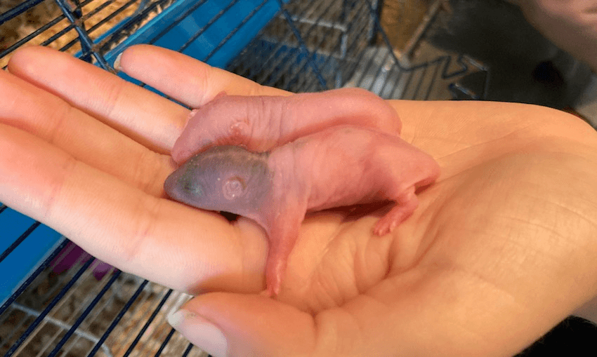 Clarke then cradles two squirming bright pink rat babies from her latest litter, only three days old, in the palm of her hand. They look like something out of Wellington Paranormal, making almost imperceptible squeaking sounds from indiscernible mouths, eyes still welded shut. The mother rat cautiously approaches the opening of the cage and tenderly lifts them out of Clarke’s hand with her teeth, carrying them back one by one to the rest of the litter.