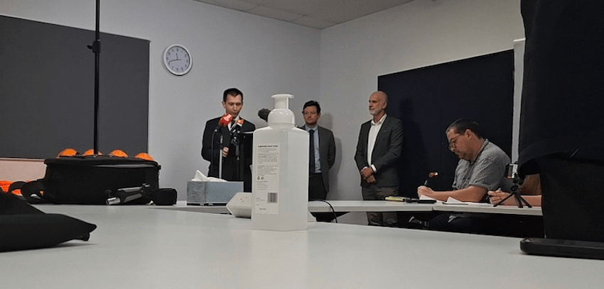 Brown stood in the corner of the room with his hands clasped in front of him. Beside him was a table stacked with several bright orange hard hats and neatly folded orange hi-vis vests, and behind him stood two representatives from Health New Zealand. “How is everyone today?” Brown asked the gathered Dunedin media. “We’ll tell you in a minute,” a voice from the back answered. “Very good. Excellent. Cool,” Brown replied.