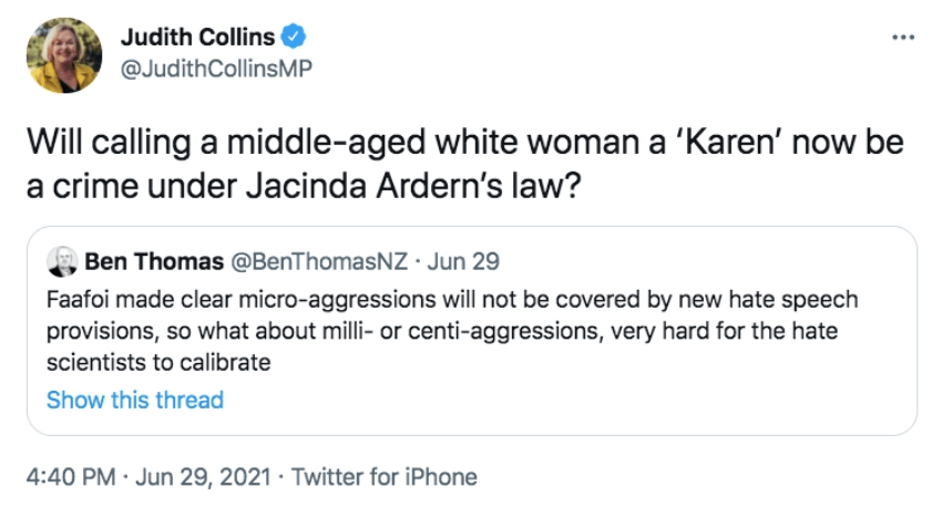 “Apparently insulting women for either being named Karen and/or for being middle aged white women is fine, under Jacinda Ardern’s new law,” she tweeted.