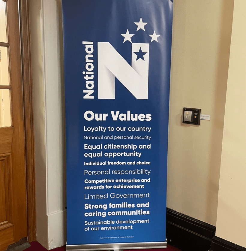 If I couldn’t read I’d assume this has “live, laugh, love” typed all over it. I can’t explain it but National’s new “values” banner holds a strong energy of she-who-shall-not-be-named.