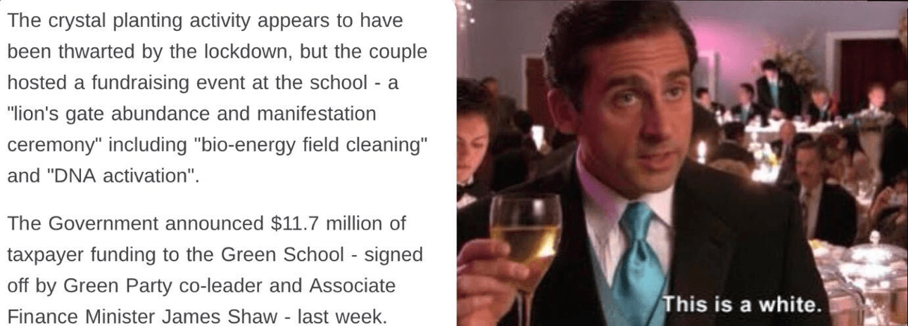 James Shaw was doing so well. He had that laugh which was great, and also that laugh which was great. But then he laughed all the way to the bank and approved nearly $12m of funding to a Taranaki private school despite the Green Party being explicitly against funding private schools. Methinks Shaw won’t be laughing in front of reporters anytime soon.