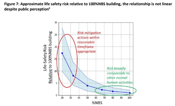 There were widespread misunderstandings about what the grade signified, even within the industry. It’s a measure of life safety risk, not building durability. A 100% NBS building may still suffer immense and costly damage in an earthquake, but it’s less likely to kill people. And it’s not a purely linear ranking; the risk scales considerably as the grades get lower.