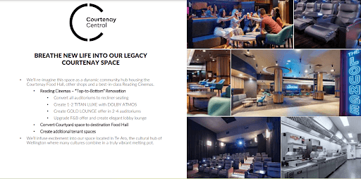 The company’s 2019 report, soon after the complex closed, said it was “laser-focused on reinventing the Courtenay Central space” and revealed details about the redevelopment plan. It included a top-to-bottom renovation, converting all auditoriums to recliner seating, converting some cinemas to larger premium offerings to compete with Imax, an “elegant lobby lounge”, a new destination food hall, and additional tenant spaces.