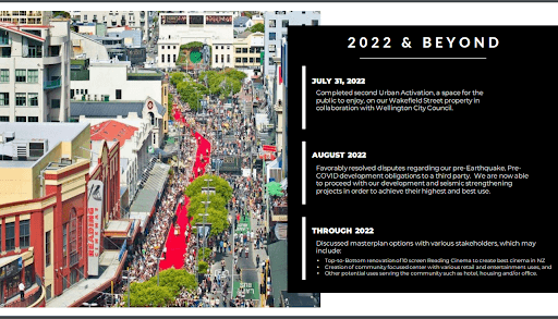 Investor reports continued to hype up the value of Wellington since the closure.“Wellington continues to be rated as one of the top cities in the world in which to live, and we continue to believe that the Courtenay Central site is located in one of the most vibrant and growing commercial and entertainment precinct areas of Wellington,” this year’s annual report said, emphasising its proximity to the new Tākina conference centre and the future Golden Mile upgrade.
