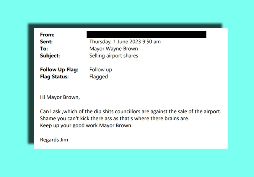 “Can l ask which of the dip shits councillors are against the sale of the airport. Shame you can’t kick there ass as that’s where there brains are. Keep up your good work Mayor Brown. Regards Jim,” said one.