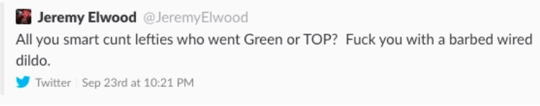 I hadn’t heard of Jeremy Elwood until I witnessed the above tweet doing the rounds, and then I remembered he drunkenly hosted a quiz night I used to attend out in West Auckland during my uni days, I think?? Anyway, who cares. He’s gross, and he thinks graphic sexual violence is a clever and novel way to illustrate a “point”. Has anyone explained MMP to him yet?
