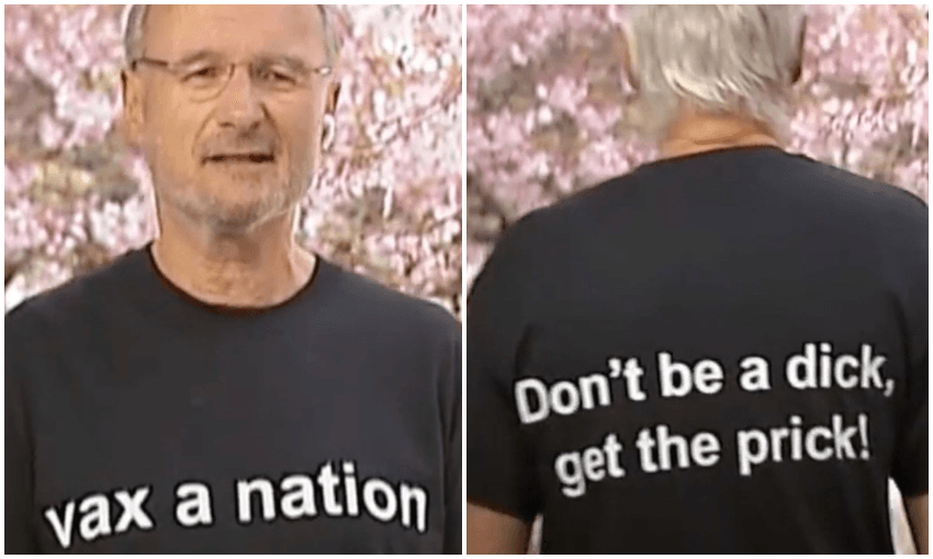 Wearing a t-shirt with the slogan “Vax a nation” on the front and “Don’t be a dick, get the prick” on the back, he said widespread mandates and regulations were the obvious way to get our vaccination rates up.