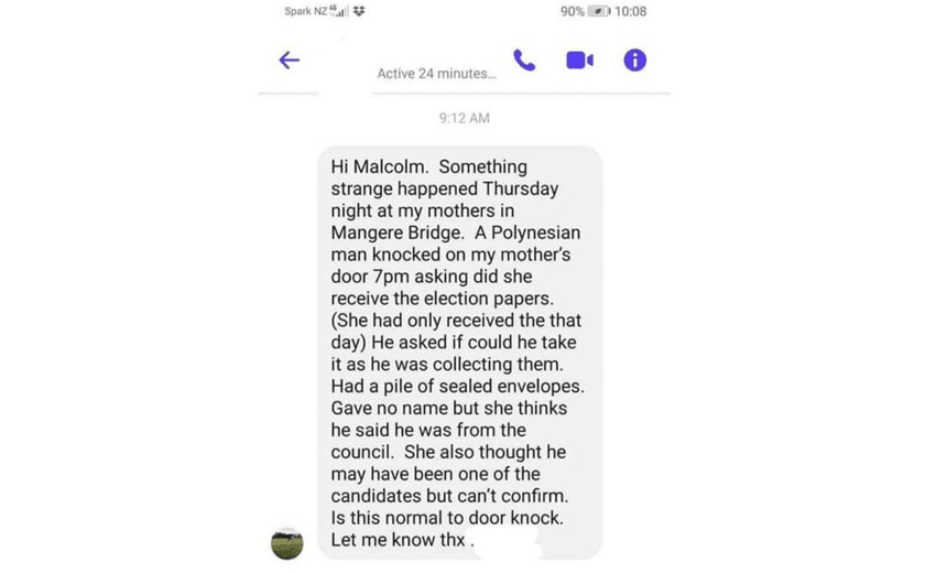 On Saturday morning, Malcolm Turner, right-leaning candidate on the Communities and Residents ticket, posted a series of screenshots on the Māngere Bridge community Facebook page he runs. The screenshots showed messages from a person claiming to have been approached by a “Polynesian” man wanting to collect postal ballots.