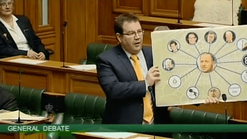 Labour’s Grant Robertson got crafty back in 2013, whipping up a “Web Of Deceit” on some huckery old cardboard and showing it off like he’d just won an Honours Award at the local A&P Show. Prime minister and apparent part-time spider John Key was at the centre of Robertson’s web, while those caught in it included Kim Dotcom “and his giraffe” and what appears to be a budgie, an acorn and the alphabet. Politics! Always full of surprises.