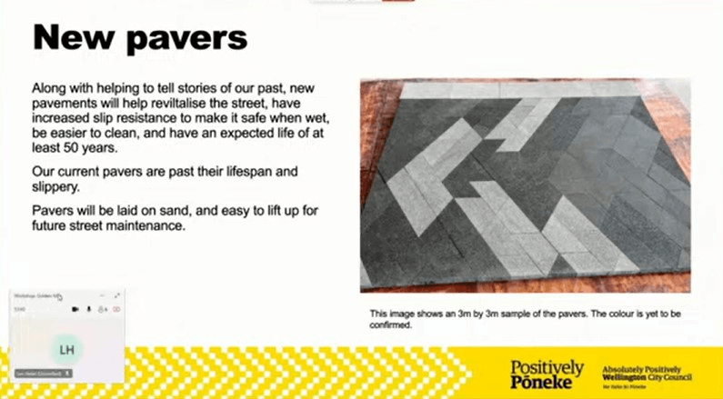 Officers revealed the design of new pavement stones which they promised would be grippier and easier to clean than the horrible orange slippery banana skins that currently line the Golden Mile. There are some minor design changes around Courtenay Place; the new design will remove the left slip lane onto Cambridge Terrace, which will allow for enough space to keep the public toilet block in its current location.