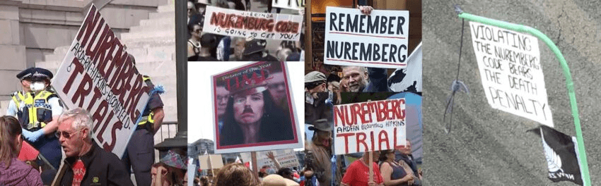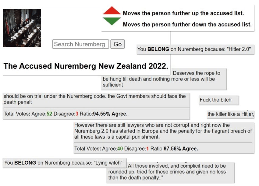 On the site, users are encouraged to add to the “accused list” individuals involved in the Covid response and the vaccination programme. They can then be up-voted and down-voted by other visitors. In its name, theme and imagery, the site is premised on the post-WWII Nuremberg trials of Nazi war criminals, which resulted in 10 executions by hanging. “Nuremberg” and “Nuremberg 2.0” have for many years been stock tropes of the far-right. In the last two years they have been adopted by more extreme parts of the conspiracy-laced anti-lockdown, anti-vaccine and “plandemic” rhetoric around the world. “Nuremberg” placards have been a regular sight at New Zealand anti-mandate protests, forming part of a wider appropriation of Holocaust-linked images, together with baseless claims that the New Zealand vaccination programme breaches the Nuremberg code, a set of principles for medical research that emerged out of the trials.