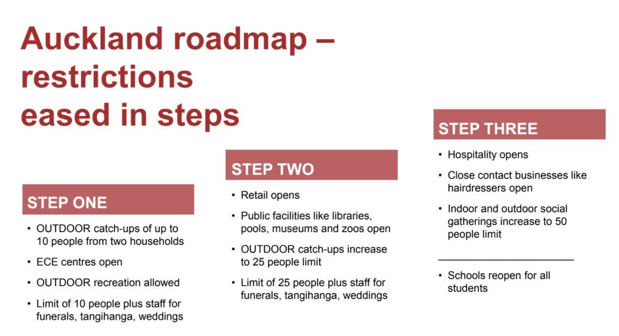The three-step pathway out of lockdown will begin this Tuesday night at 11.59pm. At this time, Aucklanders will be able merge their bubbles outdoors with no more than two households at a time and up to a maximum of 10 people. Early childhood education will return for all and people can move around Auckland for recreation such as beach visits and hunting.