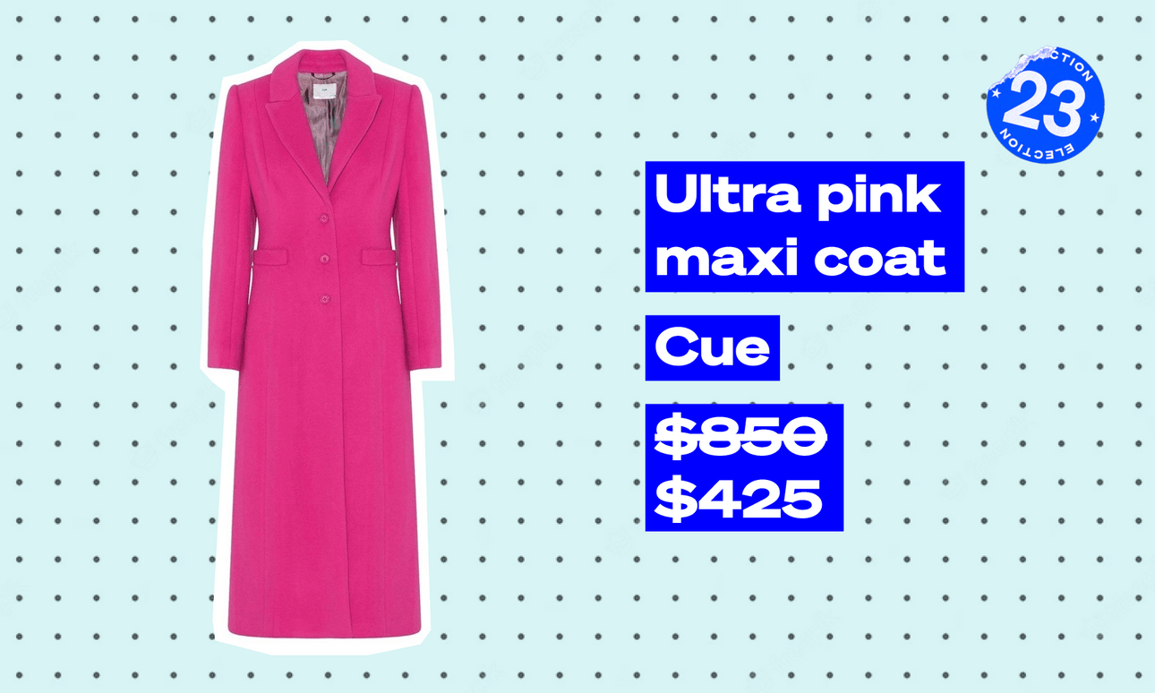 Many, maybe too many, people choose black, beige or otherwise boring-coloured coats. Not van Velden. She got her iconic aggressively pink coat from Cue last winter, putting her ahead of the pink wave created by the Barbie movie. It is sadly no longer in stock, but Showpro does have a very similar bright pink long coat for only $95. If you think you’re going to get teased for wearing pink, there is a lovely purple coat at Gorman which will protect you from the haters.