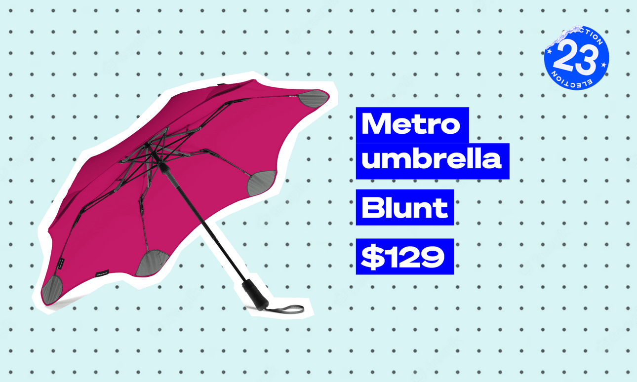 I like these umbrellas because when I was young my mother instilled a fear in me of other people’s umbrella points stabbing out my eyes. The smallest size, Metro, which van Velden holds here, is $129, so I have not bought one. She bought it “out of necessity” when she forgot her old umbrella in an Uber on the way to a meeting. I like to pretend I have no needs and that getting wet is fine. If you do have needs and you like living lightly but in the fast lane, Blunt thinks this is the umbrella for you. They say the “rigid wing-like surface… withstands all wind conditions” and unpaid spokespeople say that this includes Wellington. Think of my glistening seeing face orbs and buy one.