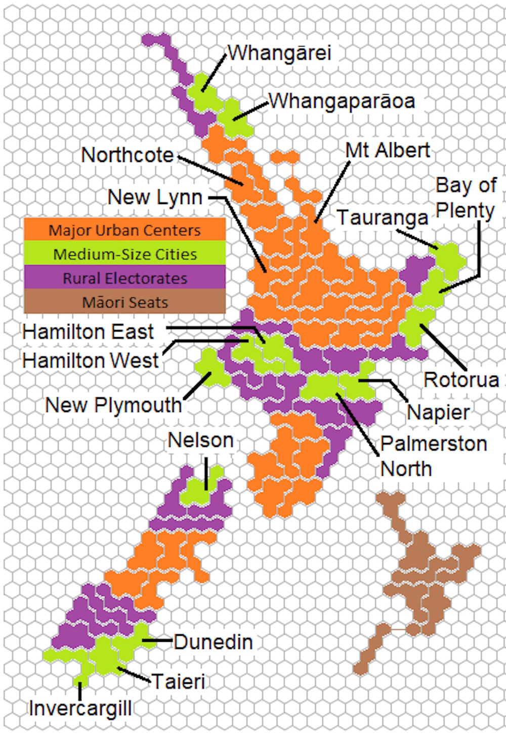 This “hexamap“ reflects the equal power of each electorate, and lets us display the political results more accurately. It retains the general shape of the country, and tries to keep each electorate in a similar position relative to its neighbours.