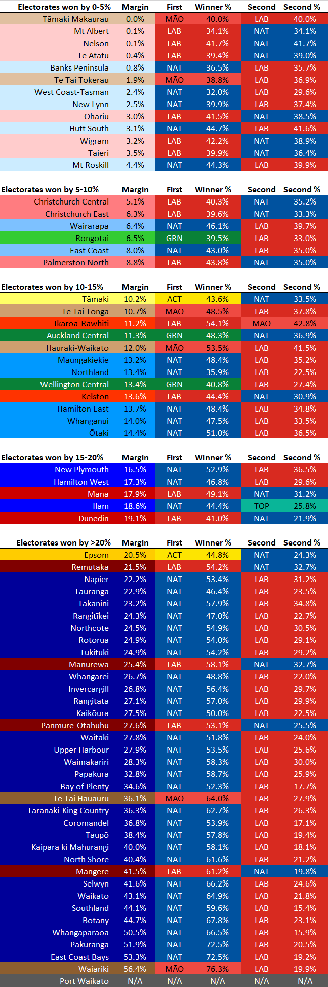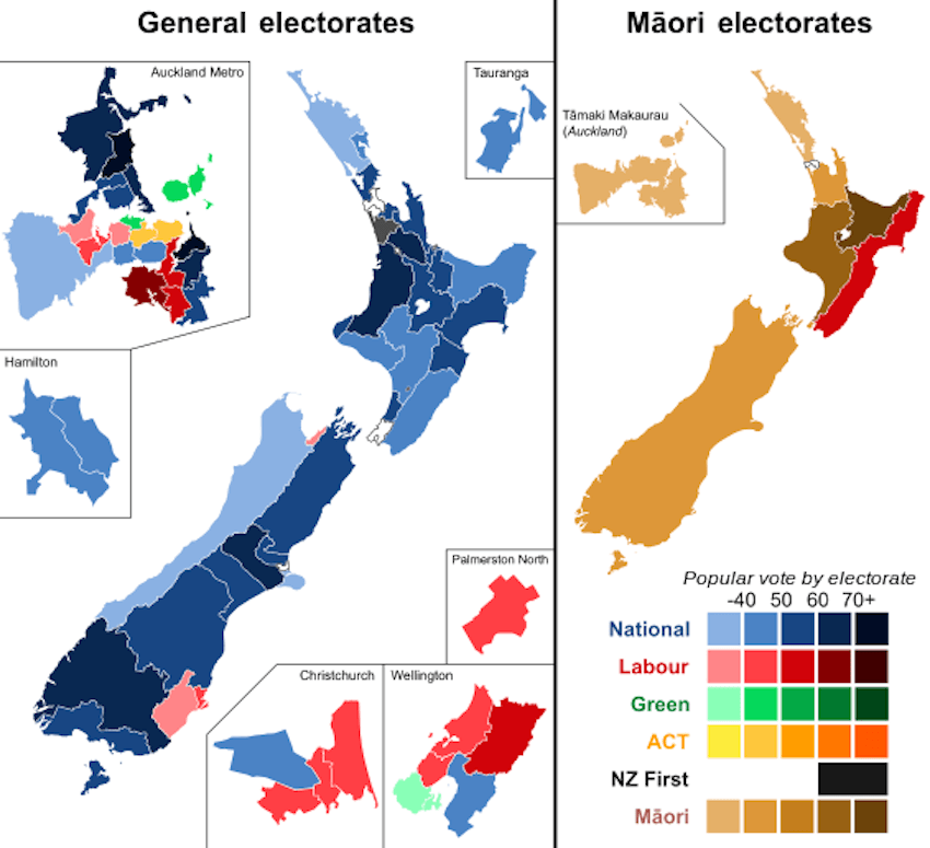*The Port Waikato electorate had no electorate votes counted after a candidate died shortly before the election, which is why that electorate is greyed out.
