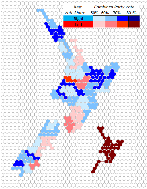 Finally, we can also use the hexamp to illustrate the political balance of the country. We do this by comparing the combined votes of the left and the right parties to the country as a whole. It’s a similar picture to 2020 (with most changes simply reflecting shifts among the two blocs, such as NZ First’s votes having exited the coalition government with the left parties after 2020).