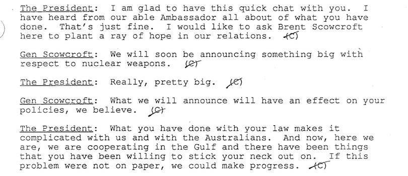 The two leaders, who had met a decade prior, have some chemistry. But the purpose of the conversation is Bush pushing for New Zealand to change its nuclear-free policy, especially in the light of Bush’s then unannounced move to take nuclear weapons off surface ships.