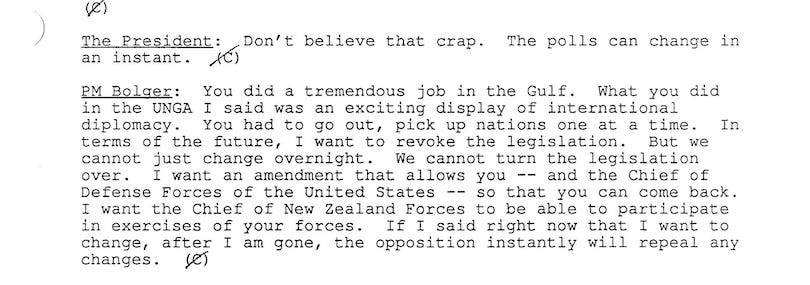 Bolger spoke about this meeting recently, and reportedly said that he “did not concede anything” on the nuclear-free policy, “and hoped [New Zealand] never would”. But while the transcript shows Bolger resisting making any promises to overturn the ban, it certainly shows him telling Bush he’d like to.