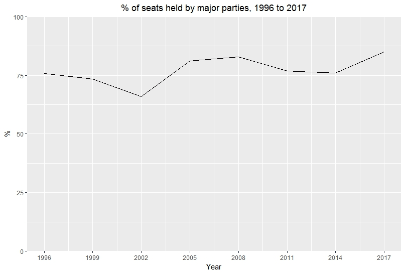 Although we currently have a very MMP-style arrangement with the second-largest party forming the government instead of the largest, this is our least diverse parliament in terms of seat allocations since the introduction of MMP. Eighty-five percent of the seats in the house are occupied by the two major parties. It’s a ratio that’s been creeping up – albeit unsteadily – over the past 22 years and it will be interesting to see if it constitutes a trend with National and Labour increasingly dominant in our politics, or if some correction kicks in and there’s a resurgence of small parties. Or maybe this is just a variable that jumps around randomly in the chaotic system of parliamentary politics.