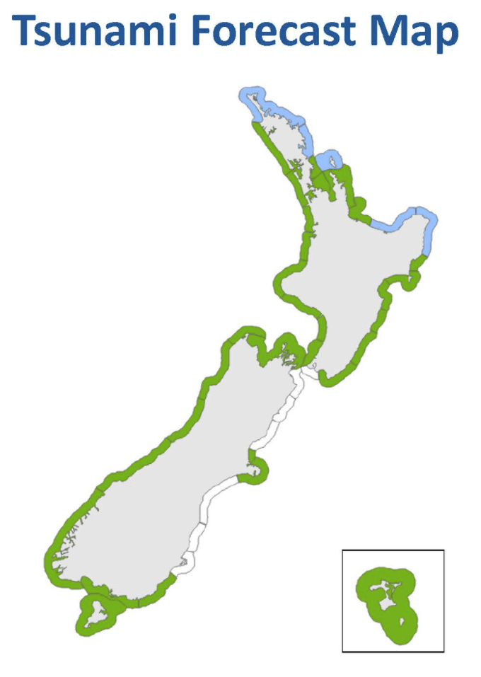 Civil Defence has updated its tsunami warning to cover much of the country. While flooding of land areas is still expected only on the west coast of the North Island from Cape Reinga to Ahipara, the east coast of the North Island from Cape Reinga to Whangārei, and Great Barrier Island, “strong and unusual currents and unpredictable surges, which could pose a threat to beach, harbour, estuary and small boat activities”, are expected in the following places: