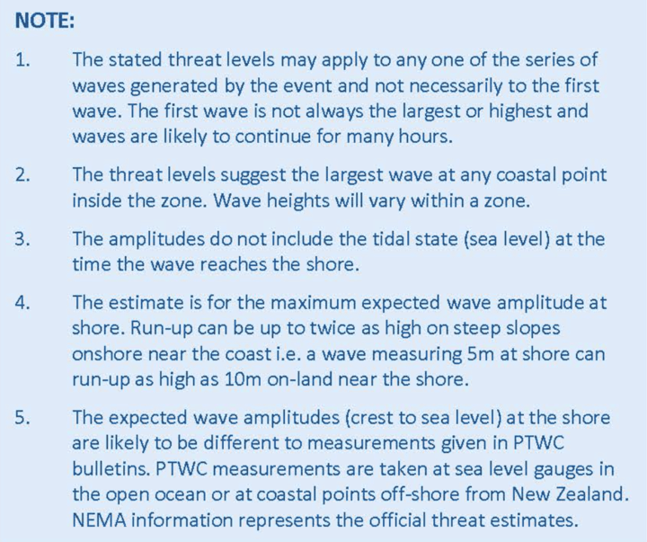 GNS Science has advised that the largest waves have now passed, and therefore the threat level is now downgraded to a Beach and Marine threat for all areas which were previously under Land and Marine threat.