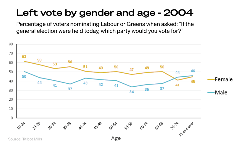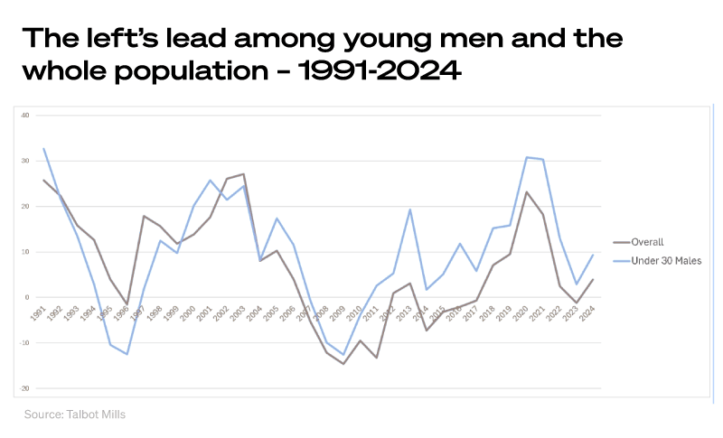 No such yawning chasm, however, can be detected here. In part, this is because young Kiwi males aren’t shifting right. Talbot Mills has charted the left’s lead among young males, repeating their line from the graph above, against the left’s lead across the whole population. Whereas, before 2004, young men were slightly more right-wing than the country at large, they have for the last two decades been slightly more left-leaning. The culture wars haven’t left Kiwi males untouched – the uber-misogynist Andrew Tate, for instance, has a following here – but the impact on voting appears negligible. If there is any polarisation in the New Zealand electorate, it lies – based on this data – in the contrast between increasingly left-wing younger women and increasingly right-wing older men.