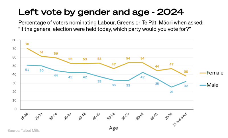 Fast-forward to 2024, and the pattern is broadly the same. Although young women have shifted even further left, nearly three-quarters of them backing either Labour, Greens or Te Pāti Māori, their male counterparts are exactly as left-wing as they had been two decades before. The kids may be alright, but they are certainly not all right. If rising conservativism is visible anywhere, it is in the older age brackets: left-wing support among men aged 70-74, for instance, has cratered, from nearly one-half to just one-quarter. Nor should this come as a surprise, given the number of older men publicly venting their objections to co-governance and cancel culture.