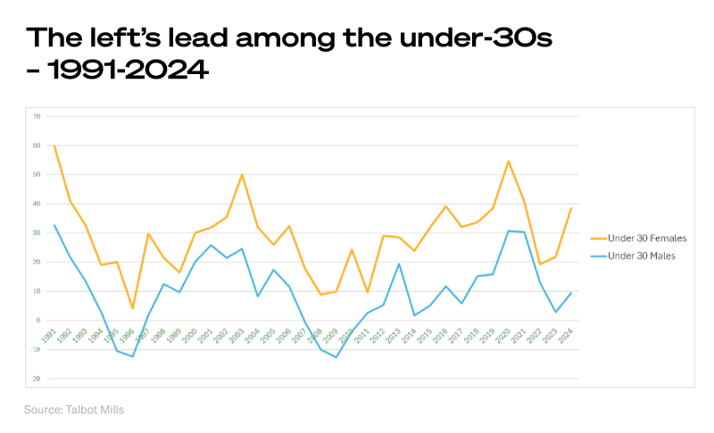 Across all the data, young men are noticeably more right-wing than their female counterparts. (Similar results are reported by other polling companies, including Curia and Roy Morgan.) At first blush, this seems to reflect divergences detected overseas. The trend is especially stark in the US, where young women are rapidly shifting left: in the last decade, Democrats have increased their lead in that demographic from 26 to 38 points. At the same time, the Democrat lead among young men has fallen, from an already-slim nine points to just five. This divergence seems to be driven by the culture wars: young women are alarmed by rising anti-abortion sentiment on the right, while half of US men under 50 believe feminism “has done more harm than good”.