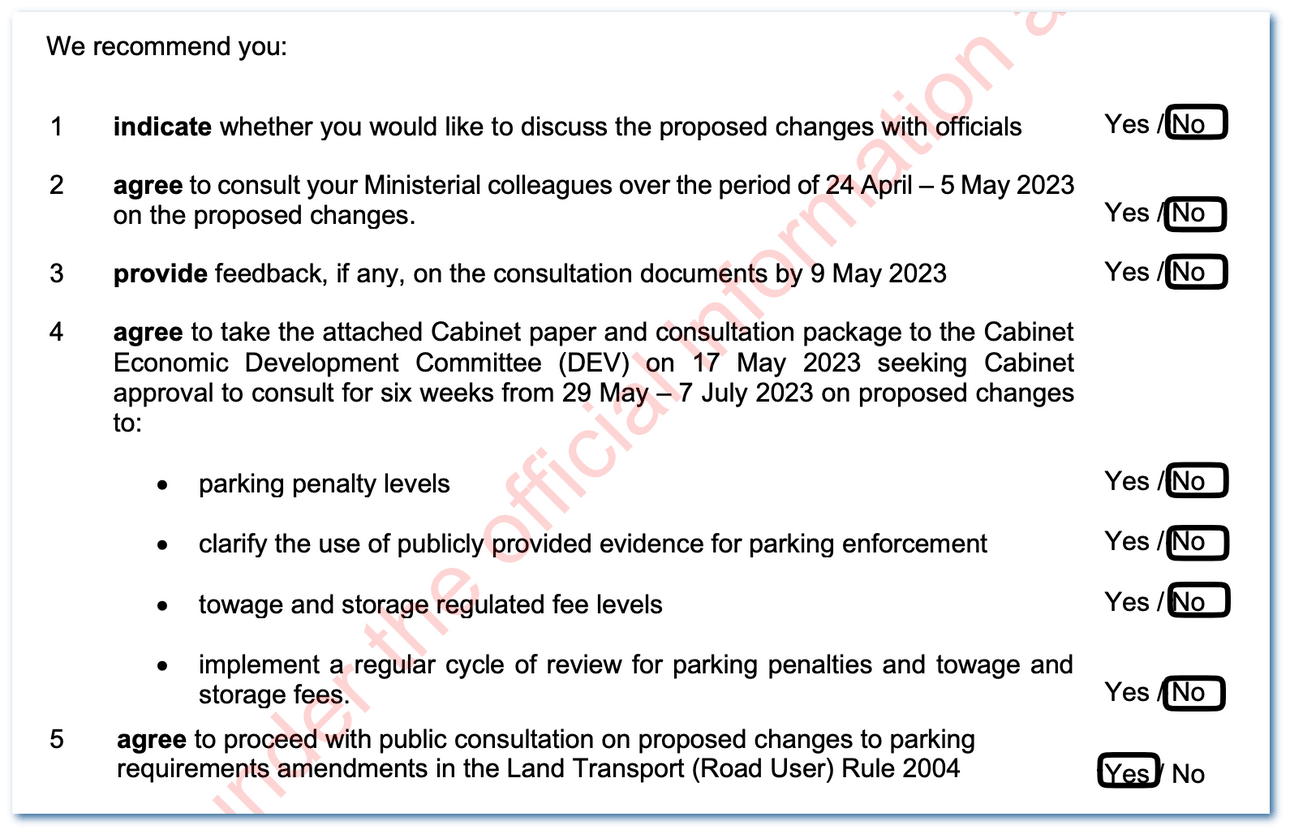 In May, after Allan had already paused the plan, then-transport minister Michael Wood told The Spinoff the government was still aiming to update penalties and gave no indication work had been put on hold. “[The Ministry of Transport] are expecting to progress some work regarding the various parking offences and penalties later in 2023 or earlier in 2024.” In the meantime, Wood said ministry officials were working on a more minor review of parking regulation – but “the maximum fines for parking offences are not being included in this tranche of updates”.