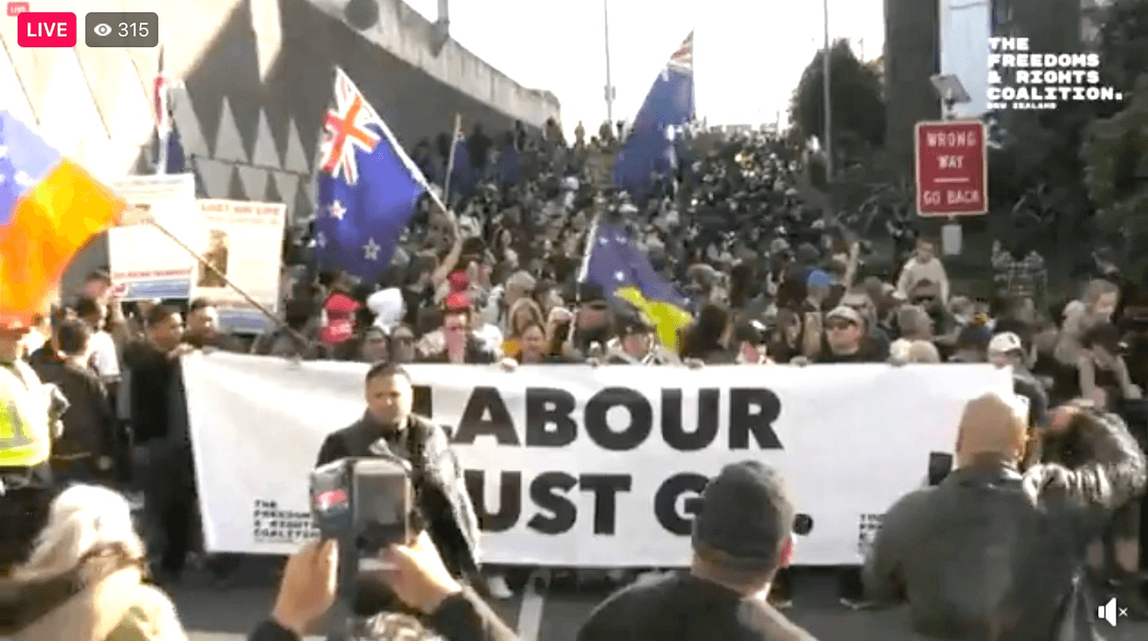 The next phase for the FRC, the “Let’s Get NZ Back Again!” campaign, begins tomorrow with a march in Auckland, followed by another a week later in Christchurch. On Monday August 22, the group intends to embark on “the great Kiwi roadtrip”. In an echo of the Canadian-inspired “convoy” that morphed into a full-blown, 23-day occupation of parliament grounds, the journey begins from both ends of the country and culminates in Wellington.