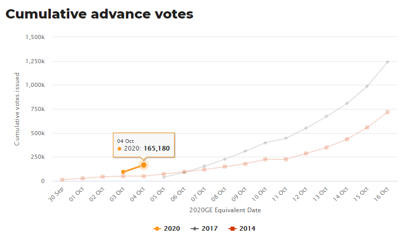 Figures show huge numbers of New Zealanders have cast an advance vote, compared to equivalent dates in 2014 and 2017.