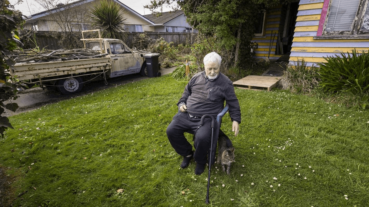 He smiles when he hears I am from Stuff and is happy to chat. He walks with a stick to his front lawn and asks me to grab a plastic chair for him to sit on.