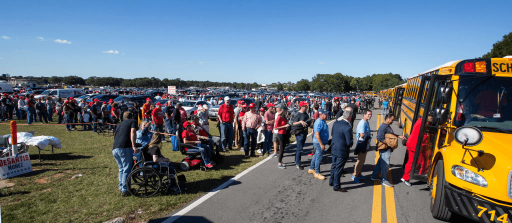 The crowd’s waiting to board the school buses requisitioned to carry an estimated 7,000 people into a hangar at Pensacola airport, in the Florida panhandle. Pensacola’s claim to fame is that it was home to America’s first European settlement (a short-lived Spanish expedition that landed in 1559) and it sits on white sands near the state border with Alabama.