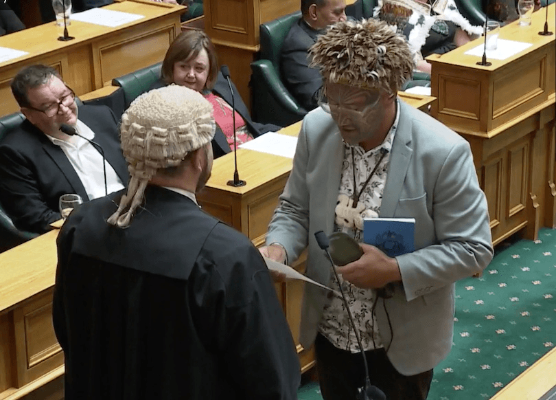 Not covered by the parliamentary rules, however, is what MPs can and can’t do before they get up to the table to swear the oath. And so, when called on to come forward, Te Pāti Māori’s MPs first stood at their seats and delivered a kind of “pre-oath” pledge of allegiance to Te Tiriti o Waitangi, tikanga and mokopuna. They then came forward and took the oath using the formal wording as required by law.