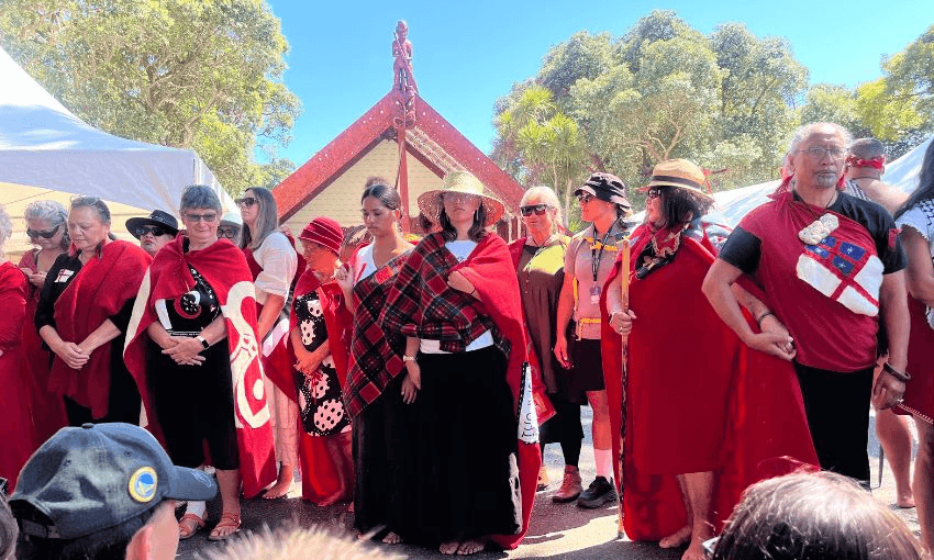 A group of wāhine haukāinga wearing paraikete emblazoned with pro-te Tiriti logos and slogans, who had formed a human barricade at the front of the marae while minister for Māori Crown relationships Tama Potaka spoke, had rose again to obscure the crowd’s view of Seymour, then lightly sang waiata to drown out his words. Potaka had been the first on the government side to address Te Tai Tokerau iwi. By the time the Greens’ Teanau Tuiono (whose party leaders wore matching paraikete gifted by the haukāinga) and Labour leader Chris Hipkins spoke, the women had taken their seats. It was clear whose kōrero was welcomed, and whose wasn’t.