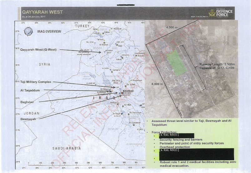 In its OIA response of 29 May 2018, the NZDF also disclosed that its “records indicate two NZDF personnel from Task Group Taji travelled to Qayyarah West airfield 22–24 July 2017, as part of a reconnaissance team to conduct a detailed analysis of the Building Partner Capacity task.” The statement itself does not preclude NZDF personnel having travelled to Qayyarah West at other times, whether for training-related activities or other purposes.